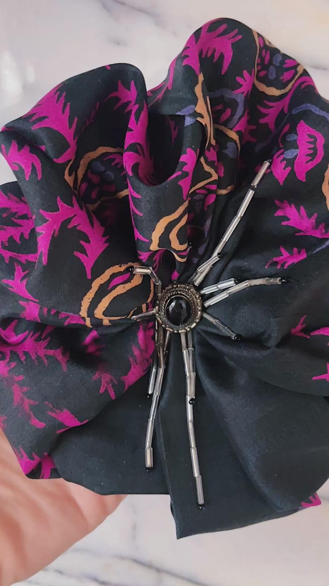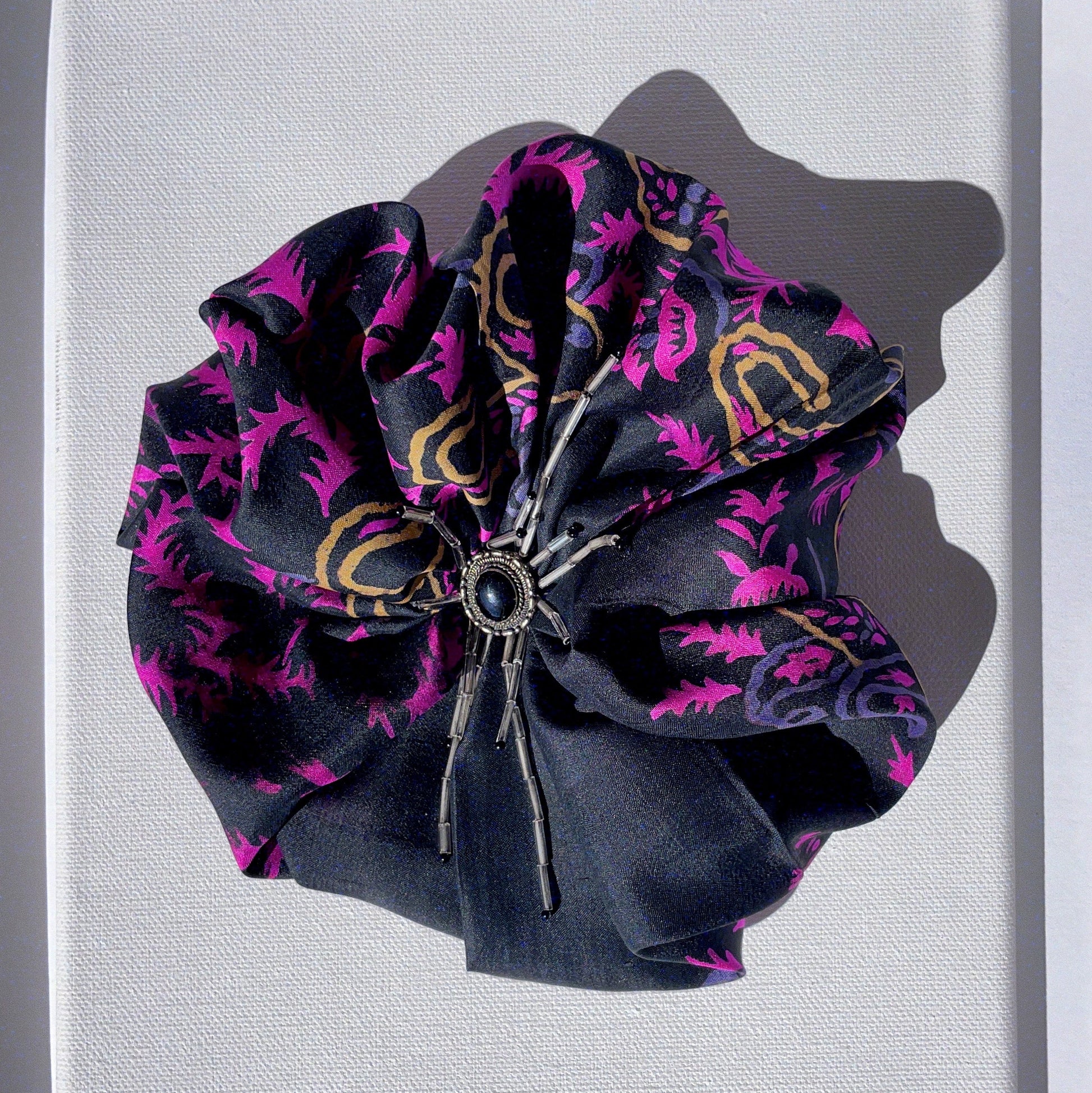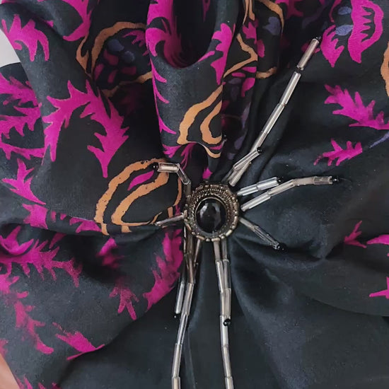 Upcycled Indian silk fabric, vintage jewellery elements, Japanese glass beads. This piece is one of a kind. Pin fastening with detachable magnet included.